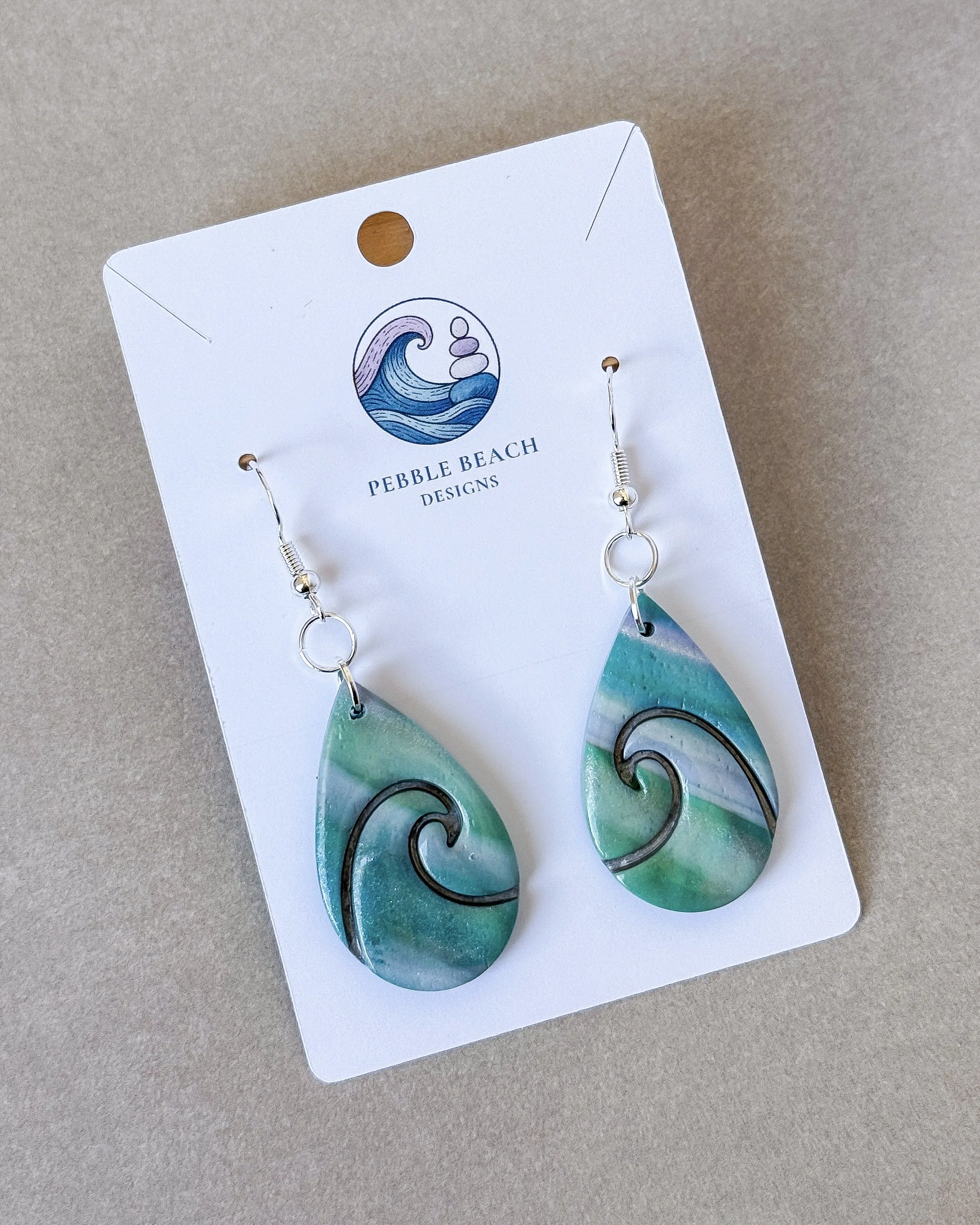 Teardrop earrings with a carved wave detail in layered ocean colours. Each pair has its own mix of blues, greens and earthy tones.